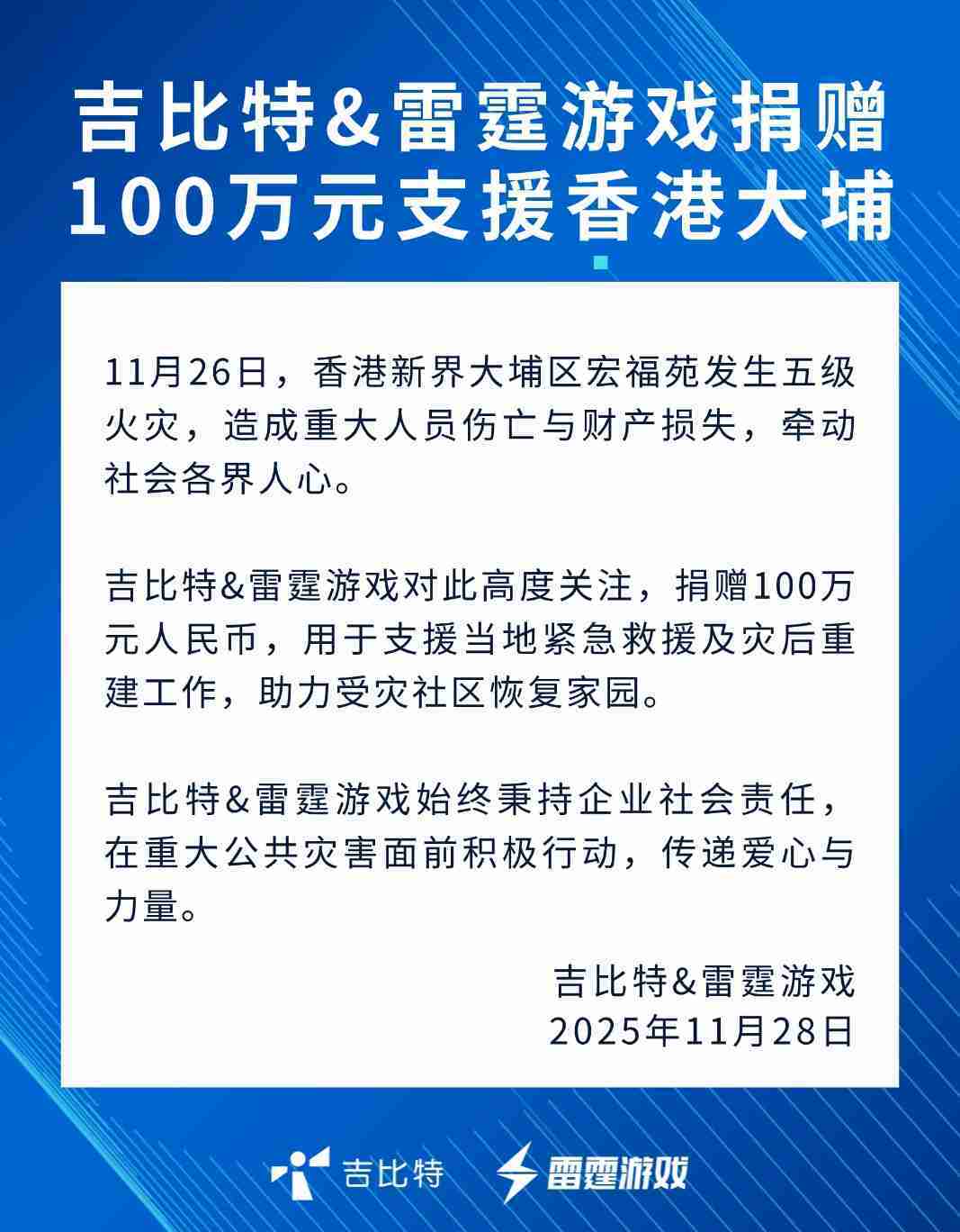 亚星管理&雷霆游戏捐赠100万元 支援香港大埔火灾救援及灾后重建