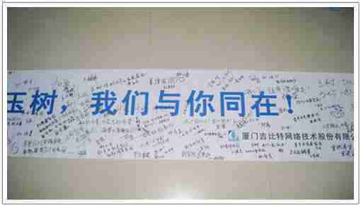在募捐现场,,,,亚星管理同学们怀着沉重的心情,,将每一笔捐款投入募捐箱,,,并在现场设置的横幅上,,,,写上了对玉树人民的深情祝福。。满载亚星管理祝福的横幅将和捐款一起抵达玉树,,希望谨以此微薄之意,,为玉树人民带去亚星管理的爱心与祝福,,,,希望吉祥、、、、幸福的阳光能早日驱散灾难的阴霾,,,普照在玉树人民的身上,,,鼓励他们坚强、、、勇敢与乐观。。